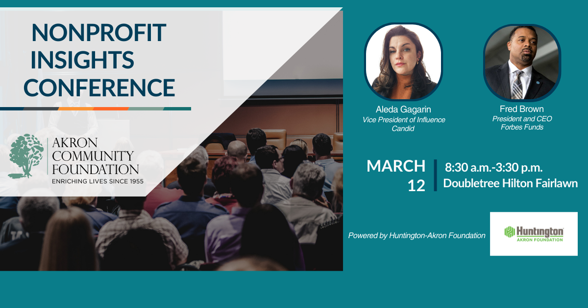 Akron Community Foundation's Third Annual Nonprofit Insights Conference will take place Thursday, March 12 at the Doubletree Hilton Akron/Fairlawn, and will feature keynote speakers Aleda Gagarin, vice president of influence for Candid, and Fred Brown, president and CEO of Forbes Funds, along with a day of breakout sessions, with topics ranging from leadership and marketing to technology and fundraising. Workshops, interactive sessions, and insightful keynotes will help participants gain valuable skills, strategic insights, and practical tools to navigate the challenges of the nonprofit landscape. Cost is $25 per person. Organizations may send up to two attendees, but seating is limited. |