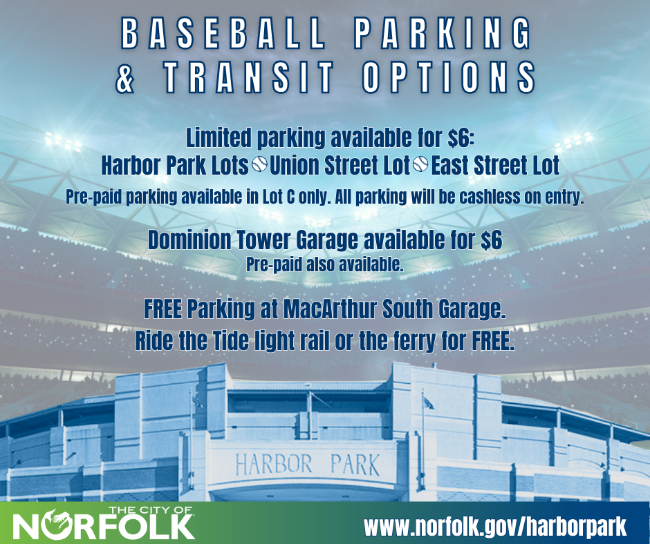 Find links for pre-paid parking as well as a map outlining all parking and transit options at Norfolk.gov/HarborPark.