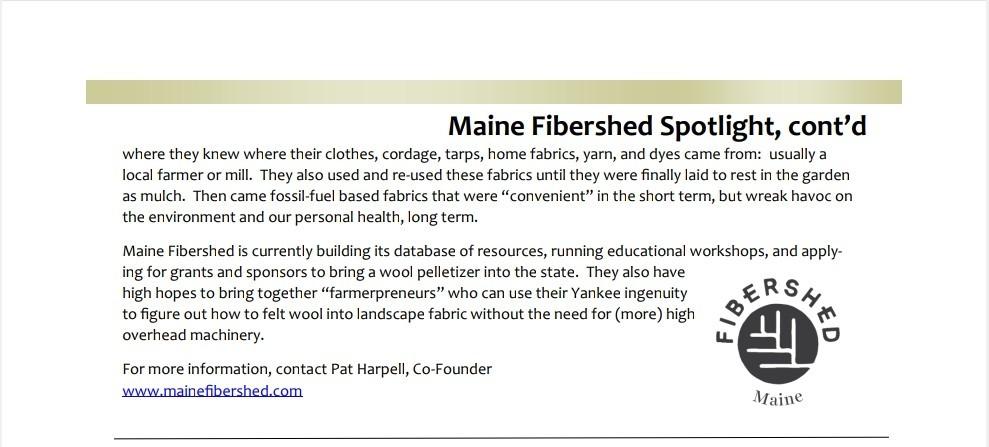 Pat Harpell, co-founder of the Maine Fibershed, will talk about easy ways that individuals can make a sea change of difference with their fiber choices. She will discuss how to differentiate fresh carbon from fossil carbon fibers, how a Soil-to-Soil system works, the importance of local fiber to our economy, and how raw wool is being used to replenish soil.