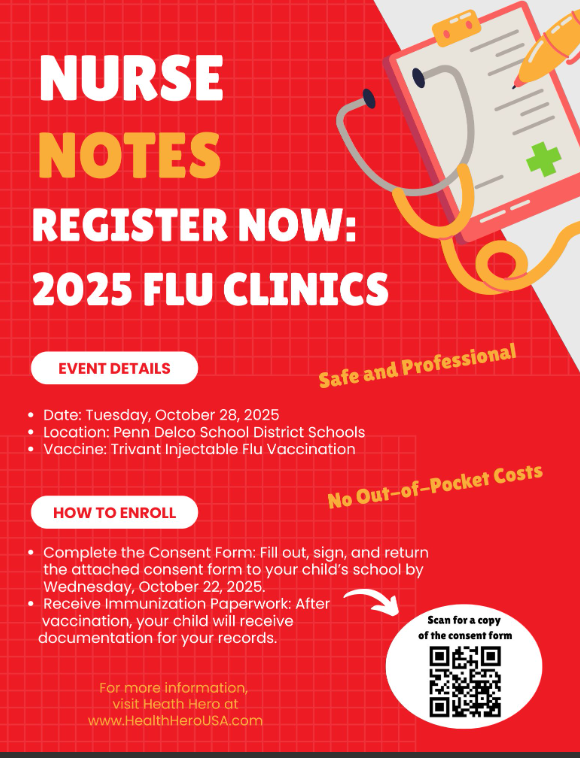 Flu Clinic Reminder: Our district will be hosting flu shot clinics on Tuesday, October 28, 2025. The clinic is safe, professional, and provided at no out-of-pocket cost. Please see the flyer below for details on registration and consent forms.