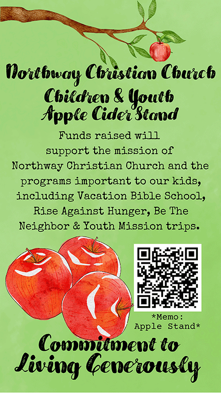 We would love it if you stopped by the stand before or after worship. They will accept cash, check, or you can donate online by clicking here, noting 'apple stand' in the memo. The children will share their proceeds as a gift to Northway, supporting the programs important to them.