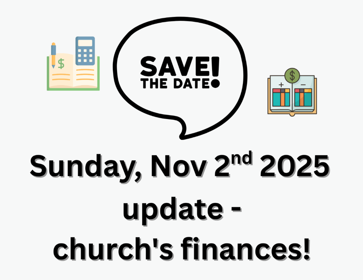 Please mark your calendars - after church on November 2, at 11:15 am, the finance team will present an update on the church's finances in the sanctuary.
