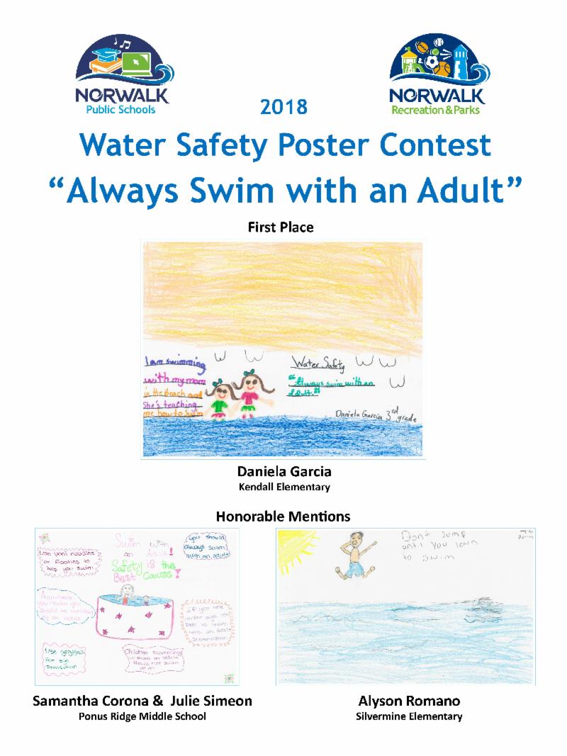 To create awareness for National Water Safety Month in May, NPS students in grades K through 8 were invited to create a poster centered around the theme of “Always Swim with an Adult.” Contest winners will be honored at Calf Pasture Beach on August 4 at 7:15pm prior to the outdoor screening of the movie Moana.Their posters will be displayed in the Norwalk Recreation and Parks Department, the Norwalk High School Pool facility and the booth at Calf Pasture. Congrats to all winners and thanks to all who entered the contest!