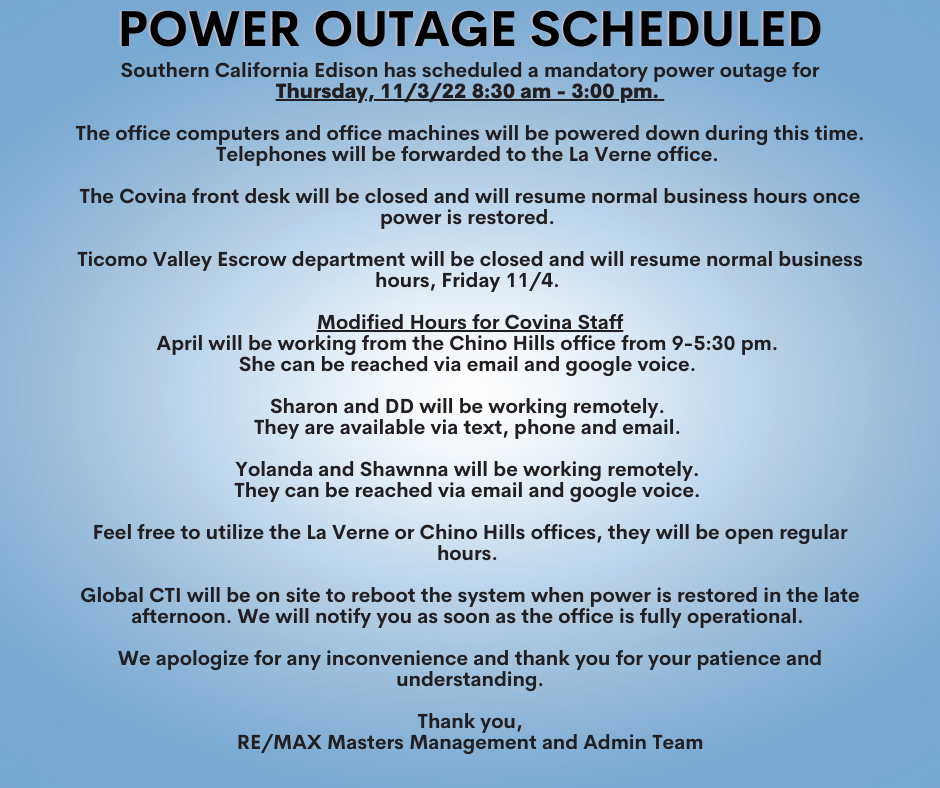 POWER OUTAGE 8:30 AM-3 PM