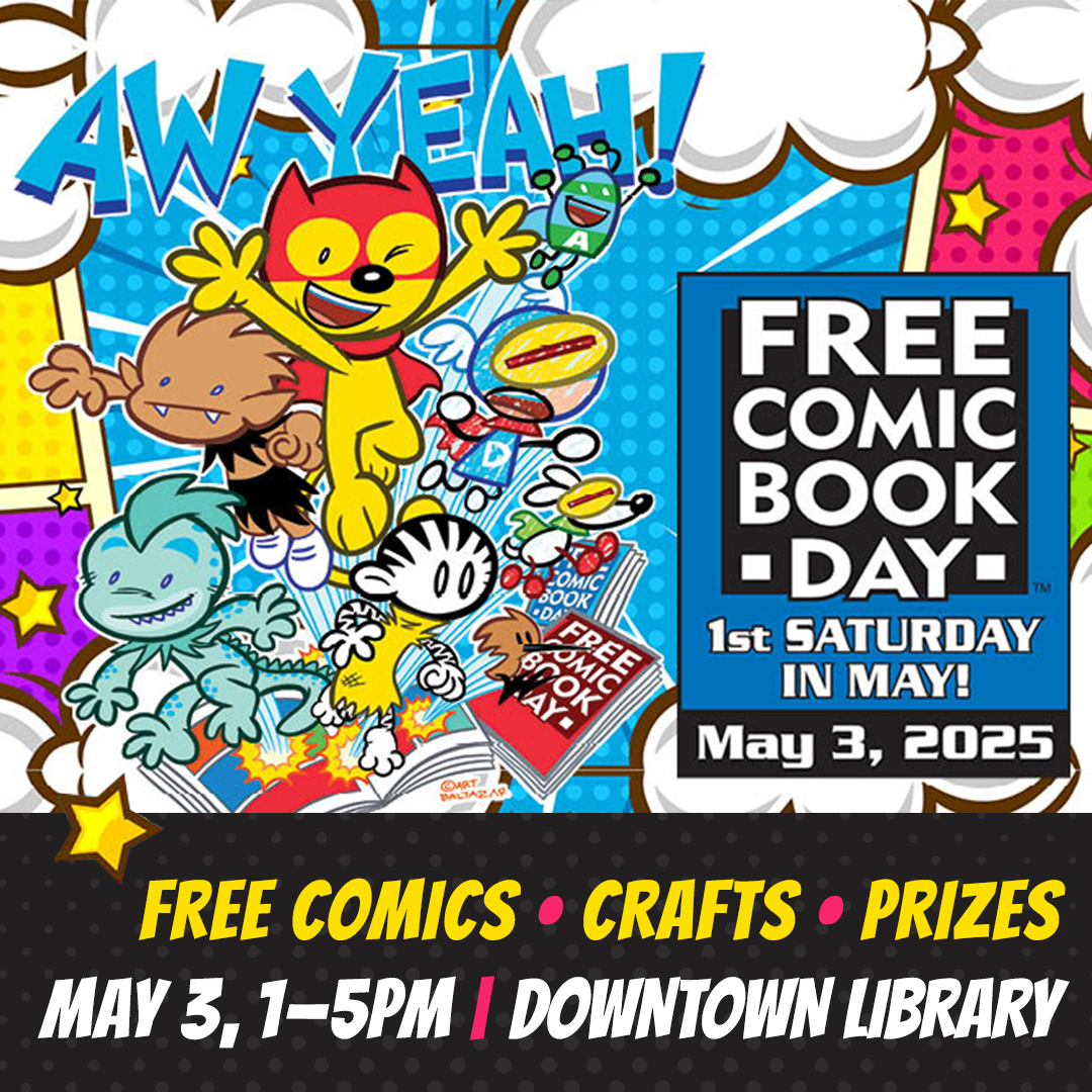 ¡Celebra el Día del Cómic Gratis en la Sala de jóvenes! ¡Cómics gratis! ¡Manualidades! ¡Y premios! ¿Quieres más cómics? ¡Llévatelos con tu tarjeta de la biblioteca! Para todas las edades.