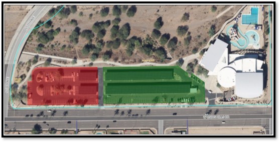 The City of Glendale has contracted with GCON to construct a park-and-ride parking structure on the west half of the Foothills Recreation and Aquatics Center parking lot. Construction is scheduled to begin next week on Nov. 10 and to accommodate this work, the west half of the parking lot (area in red in the graphic below) will be closed to vehicles beginning Nov. 10 through Jan. 30, 2026. Thank you for your patience during this work. Project Hotline: 602-532-6250