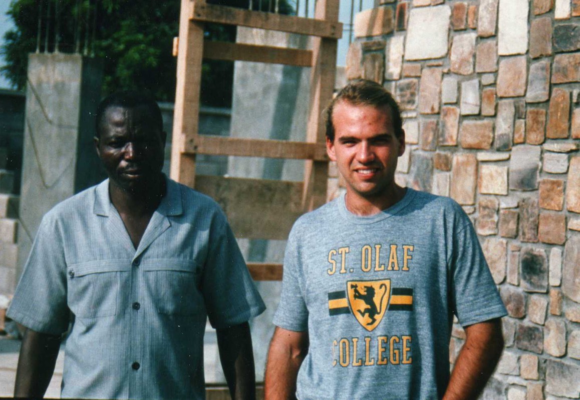 | | Pictured above: Tim Olson stands with the Rev. Andre Zoule, who later served as president of the Evangelical Lutheran Church of the CAR, at the construction site of what would become St. Timothy Lutheran Church. The photo was taken in October 1991, one month prior to Tim's death, which launched our ministry. Read Tim's story. | | | |
