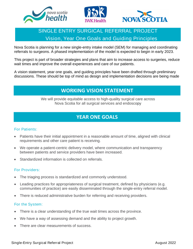 Nova Scotia is planning for a new single-entry intake model (SEM) for managing and coordinating surgical consult referrals.