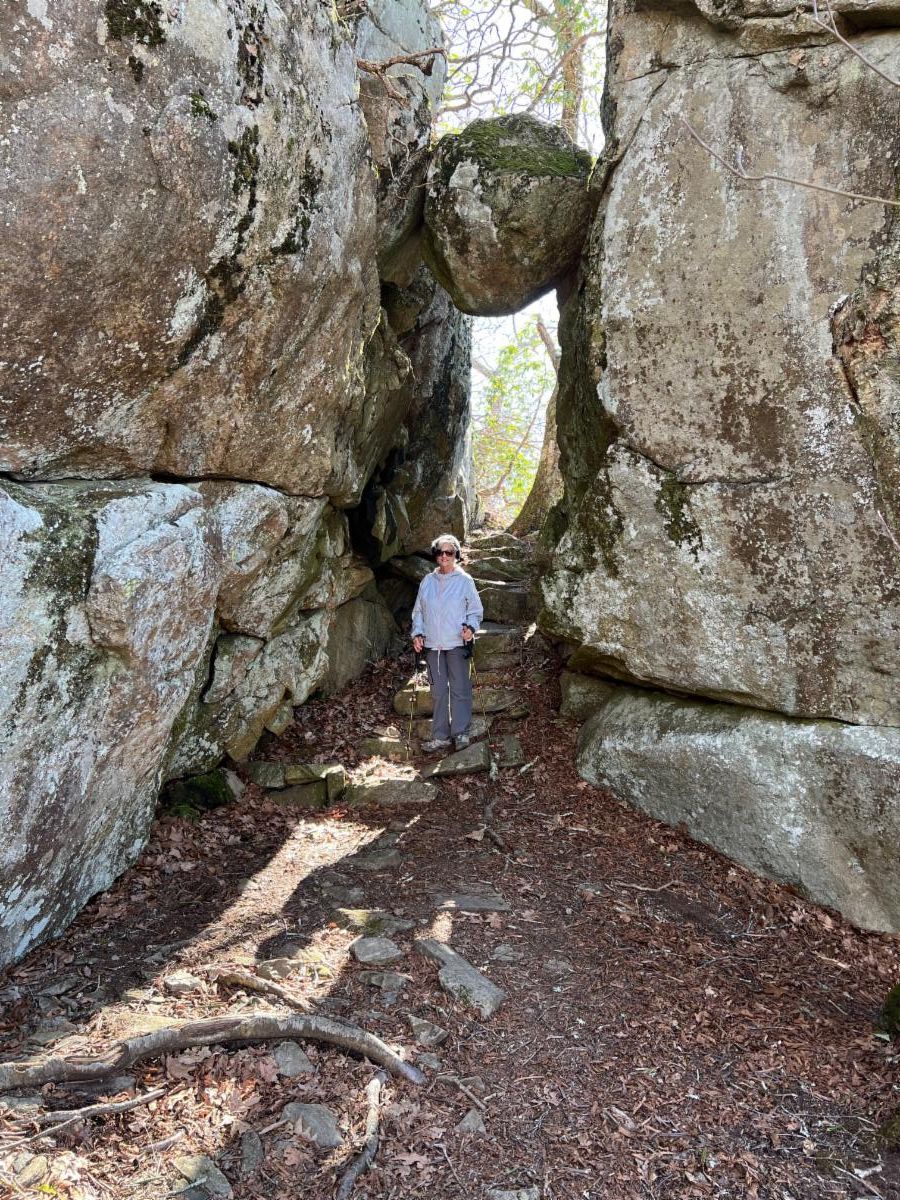 Our next hike will be on Sunday, November 9th, and we are planning to hike on the Appalachian Trail near the Blue Ridge Parkway. It will be a short, flat hike that is easier than the two hikes we have done so far. We will hike to the iconic rock formation called the Guillotine, which has a massive boulder on each side of the trail, with a very large boulder that looks like it could fall wedged overhead. There is actually no danger of the boulder falling, but it makes for great pictures, see Judy’s below. I hope all of you will be able to make it and get a photographic momento.