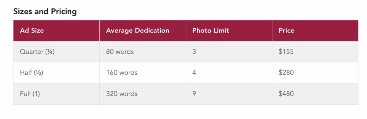 Each year, the yearbook staff sells Dedication/Tribute spaces to senior families in the yearbook. Sales began earlier this year and will continue until Tuesday, December 31.