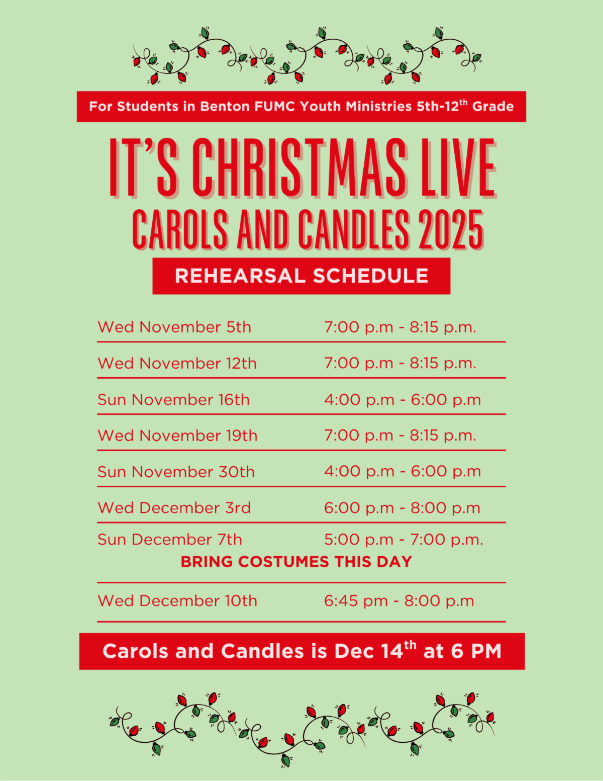🎶 Carols & Candles rehearsals continue tonight right after Discipleship Groups! This year’s performance will take place on December 14th at 6 PM, and we can’t wait to see our youth shine as we celebrate the story of Christmas together. We need your help to support rehearsal spaces and assist with props — your presence makes a huge difference! We still need parent support with Volunteers in the space! Sign Up Below!