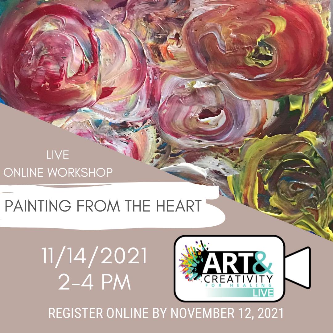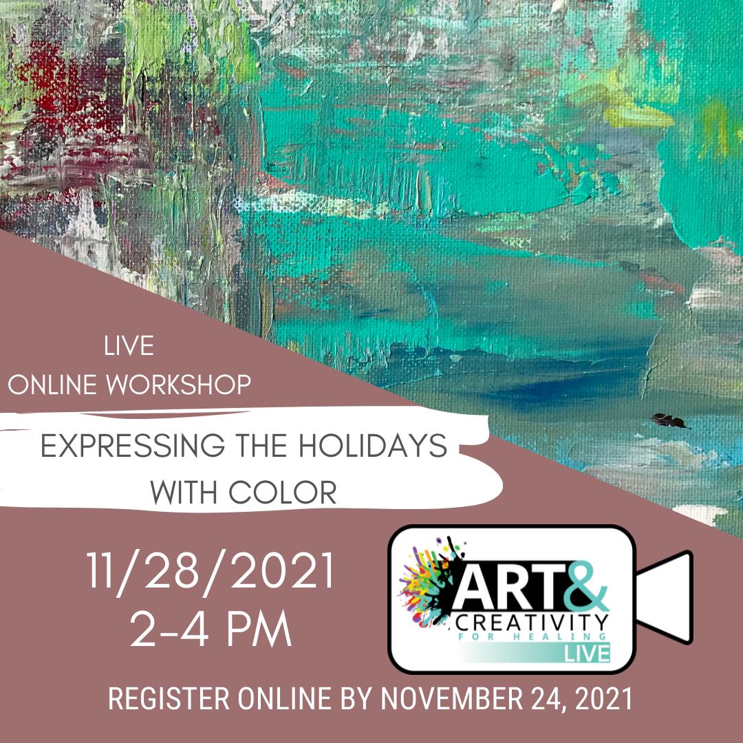 Next, if you're up for an Art4Healing® workshop, we have several live online workshop options this month. We also are holding our final in-studio workshop of 2021. Space is limited, so check out the information and register early if you're interested.