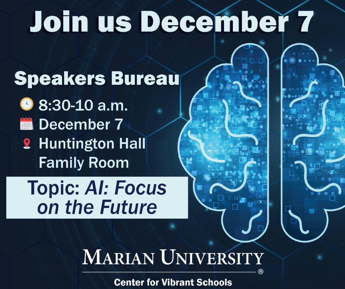 Join the Marian University Center for Vibrant Schools for a Speakers Bureau at 8:30 a.m. ET on December 7. Speakers will be covering the future of education and the way artificial intelligence can be incorporated effectively in schools. Register at https://bit.ly/49AqK29.