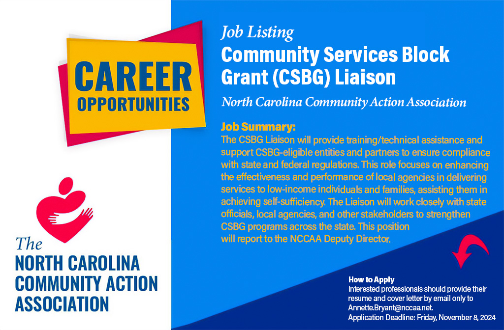 Share your community action career opportunities on our web page and have them distributed to 7000+ emails through the NCCAA newsletter! Send your job listings to communications@nccaa.net. | |
