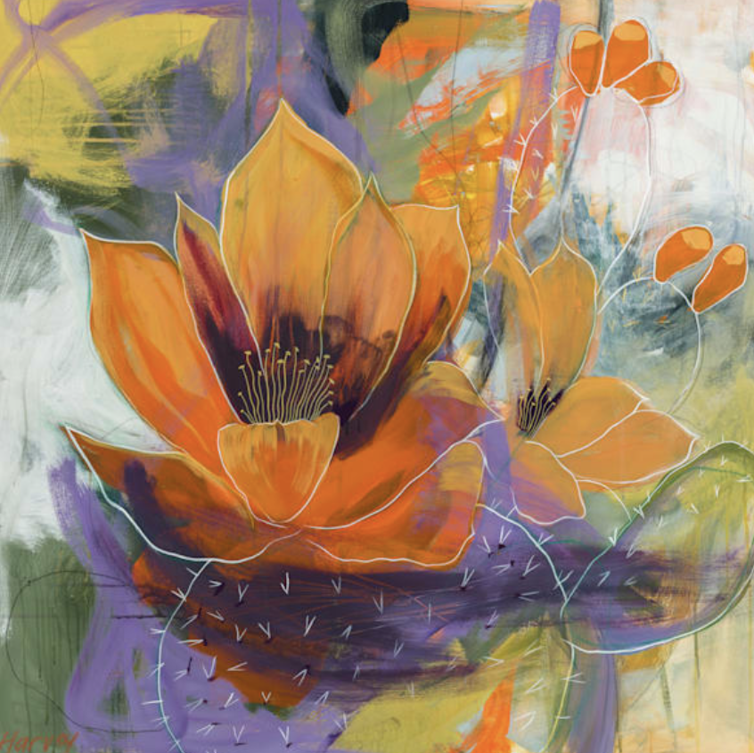 Kristin's artwork reflects her love for the Sonoran desert and a strong appreciation of the Mexican culture. She is a colorist drawn to the brilliant hues of Mexican celebrations and folk art. She paints her contemporary semi-abstract paintings inspired by these colors, and by the desert in bloom. A love for color and line is apparent in her broad, loose brushstrokes juxtaposed with crisp white outlines. She paints intuitively with an acrylic mixed media process that includes water-based crayons, chalk pastel, colored pencil and intensely saturated acrylic paints. She admits that she paints from a need to create consistent joy in her life. | |