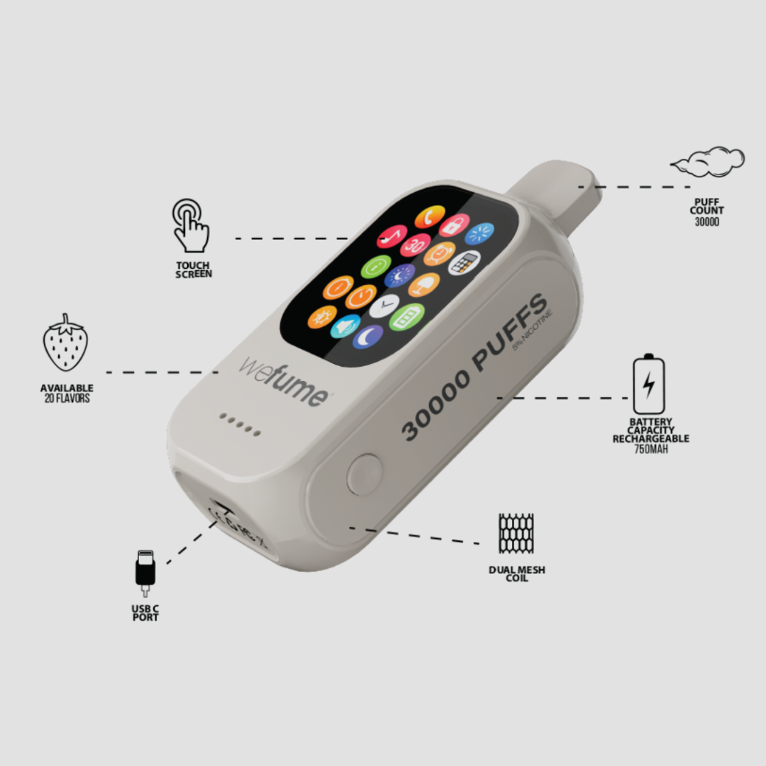 Wefume, available for as little as $21, offers up to 30,000 puffs and features technology commonly associated with a smartphone—Bluetooth, a touch screen, music streaming capabilities, call functionality, and the ability to load apps. Additionally, this device is available in 20 different flavors, further attracting younger audiences through enticing, candy-like options.