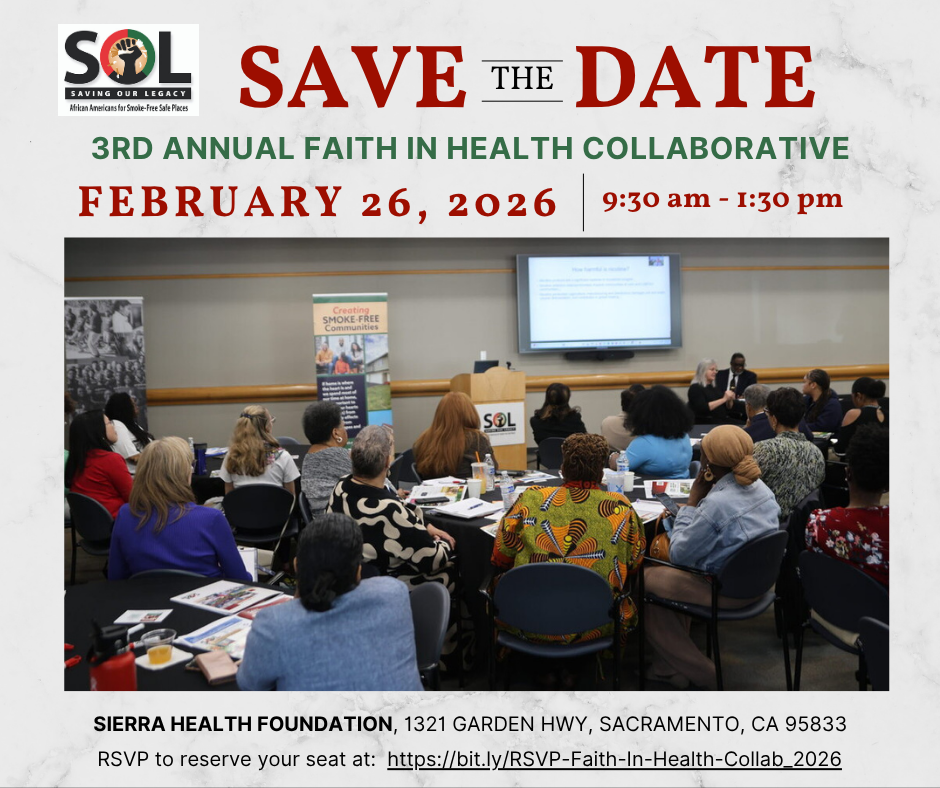 Now in its 3rd year, The SOL Project continues working with faith leaders to protect our communities from tobacco-related harm and expand smoke-free housing and cessation resources. The 3rd Annual Faith In Health Collaborative Summit takes place on Thurs-Feb 26, 2026 from 9:30 am to 1:30 pm at Sierra Health Foundation in Sacramento. The Summit will dive into what Black health will look like in 2026 amid healthcare cuts, rising chronic disease rates, and ongoing disparities—while offering practical tools, solutions, and mini-grant opportunities to help congregations build healthier, smoke-free futures.