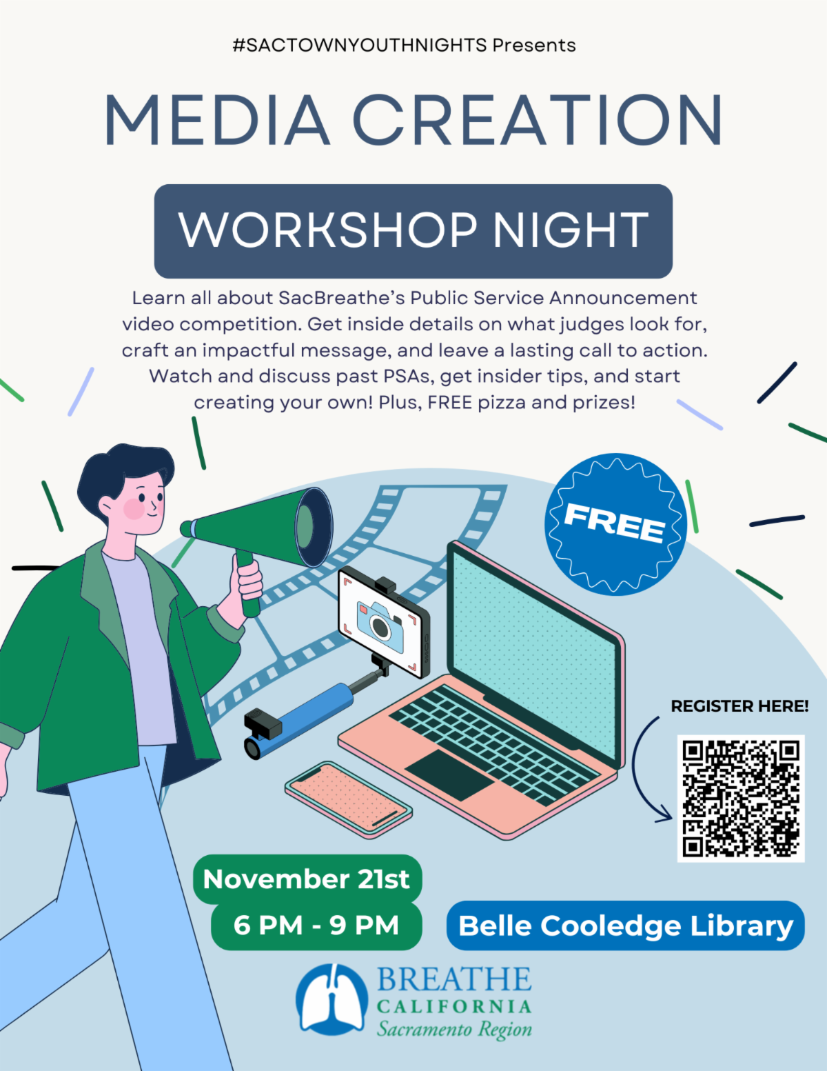 Calling all teens and young adults! Join SacBreathe on November 21 for a free Media Creation Workshop Night to prepare for their PSA Video Competition. Learn what judges look for, explore how to craft powerful messages, and start developing your own entry. Enjoy free pizza, snacks, and prizes!
