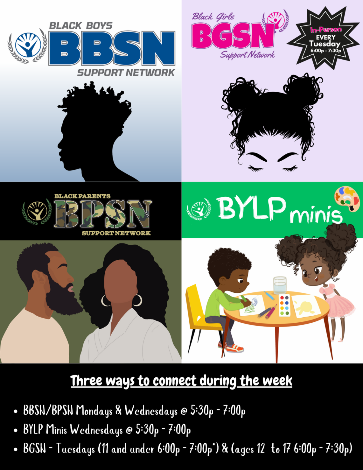 The Black Youth Leadership Project (BYLP) offers several community support networks designed to uplift, empower, and connect Black youth and families. These safe, culturally grounded spaces help individuals share experiences, build confidence, and access resources through the following but not limit to these networks: