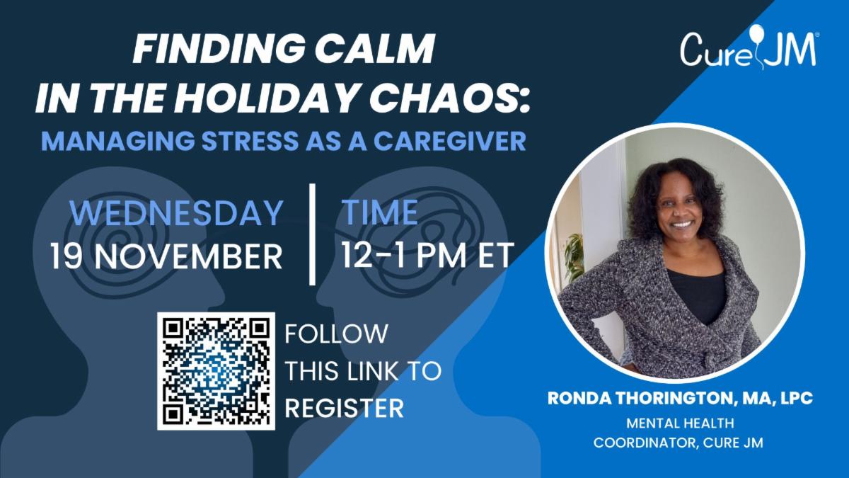 The holidays can be joyful—and overwhelming. That’s why we’re inviting grandparents, parents, and family supporters to join Ronda Thorington, Cure JM's Mental Health Coordinator, for Finding Calm in Chaos: Managing Stress as a Caregiver, a special webinar designed to help JM caregivers navigate the holiday season with greater ease and emotional balance.