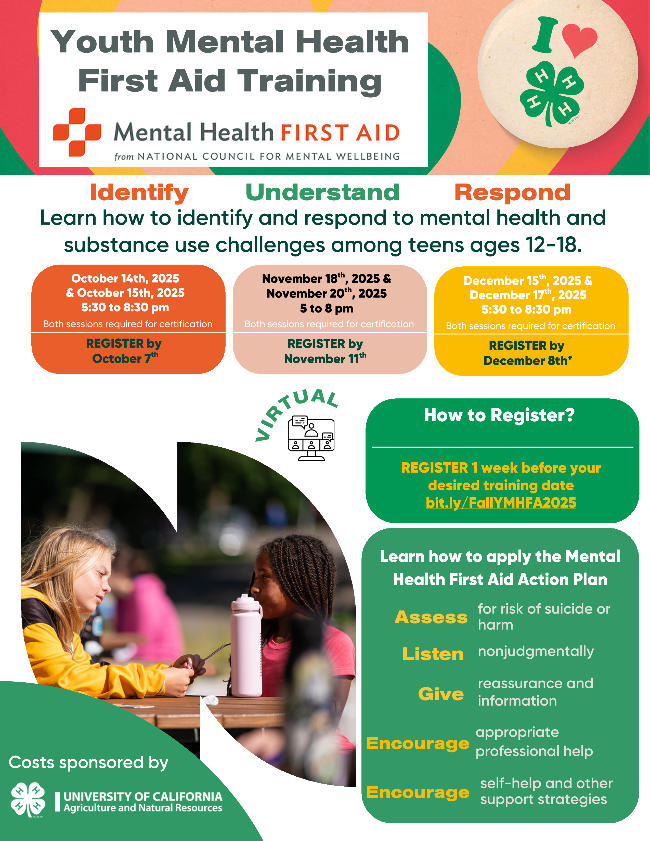 The California 4-H State Office is offering two sessions of Youth Mental Health First Aid certification for 4-H adult volunteers and 4-H professionals! In two virtual classes, you will be certified in Youth Mental Health First Aid. Please sign up to support youth in your county!