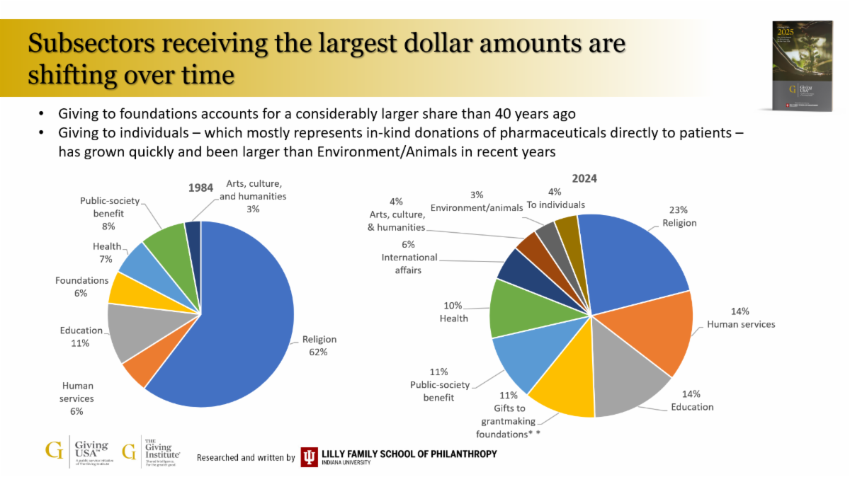 | | Charitable Giving Diversifies | | The landscape of American charitable giving has transformed dramatically over the past four decades. In 1984, religious organizations dominated philanthropic dollars at 62%, while foundations received just 6%. By 2024, the distribution had diversified considerably: religion's share dropped to 23%, while human services and education each grew to 14% of charitable dollars. Notably, giving to individuals—primarily in-kind pharmaceutical donations to patients—reached 4%, surpassing environment/animal causes at 3%. This shift reflects evolving donor priorities and new models of corporate philanthropy reshaping American charitable giving. | | Source: Giving USA, Researched by Lilly Family School of Philanthropy. “Perspectives on Philanthropy, Giving USA” Giving USA | |
