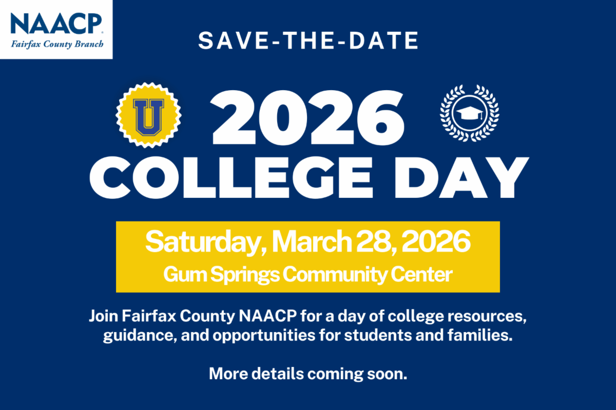 Fairfax County NAACP invites you to College Day on Saturday, March 28, 2026, at the Gum Springs Community Center in Alexandria, Virginia.