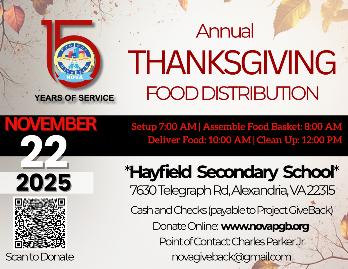 Fairfax County NAACP is excited to join the NOVA Giving Back event at Hayfield Secondary School on Friday, November 22, 2025. We’ll be helping to assemble boxes of Thanksgiving meals for area families, and we’d love for our members—and their kids—to join us!