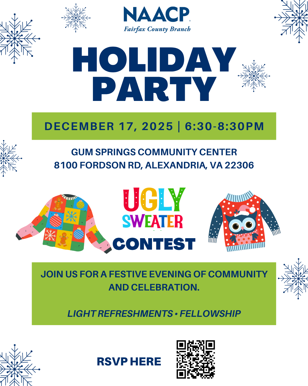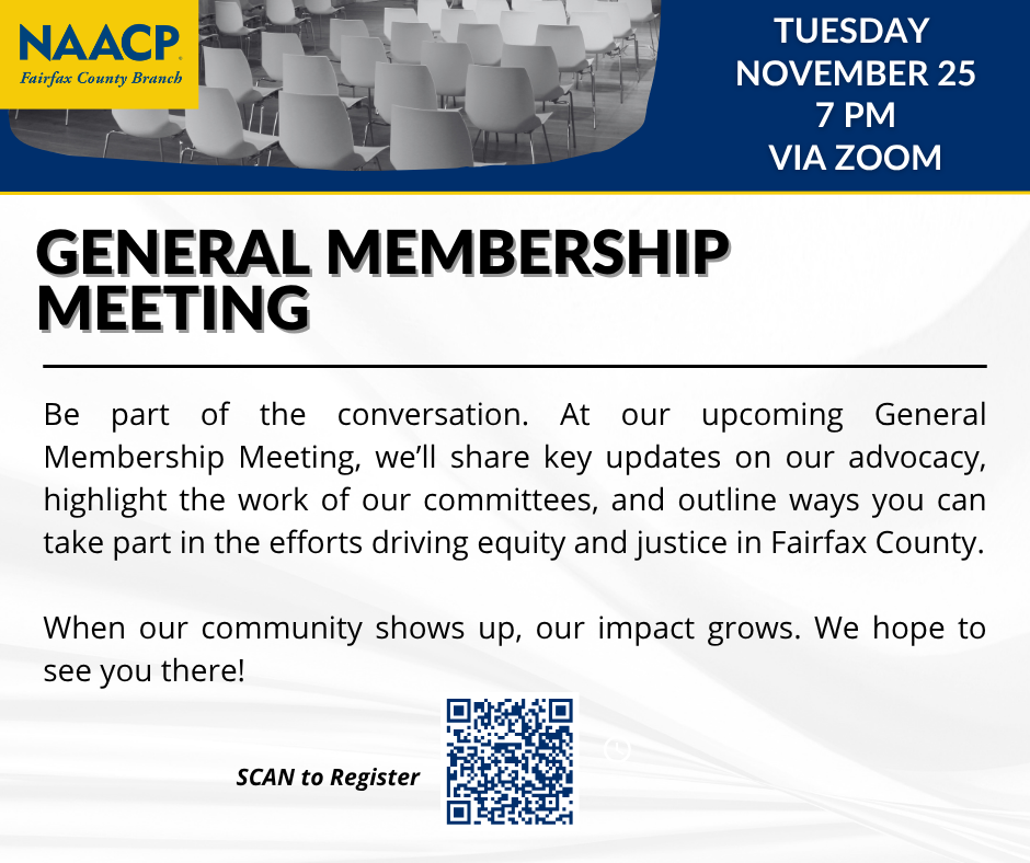 Members, supporters, and community partners are invited to attend our upcoming Fairfax County NAACP General Membership Meeting. This is an opportunity to stay informed about our ongoing advocacy, hear updates from our committees, and learn how you can get involved in the work ahead.