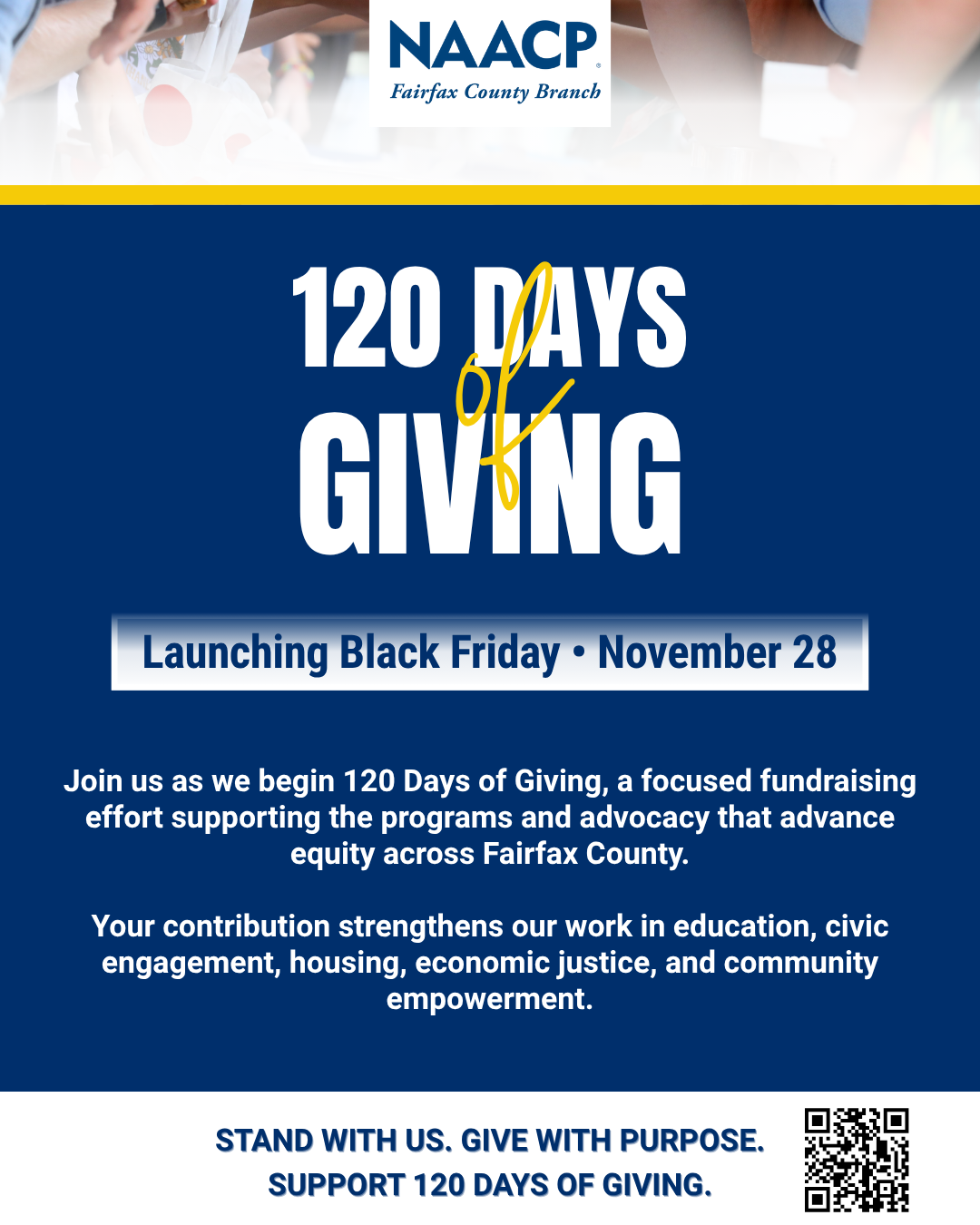 Beginning on Black Friday, November 28, Fairfax County NAACP is launching 120 Days of Giving, a focused fundraising initiative designed to sustain and expand the work we carry forward in service to our community.