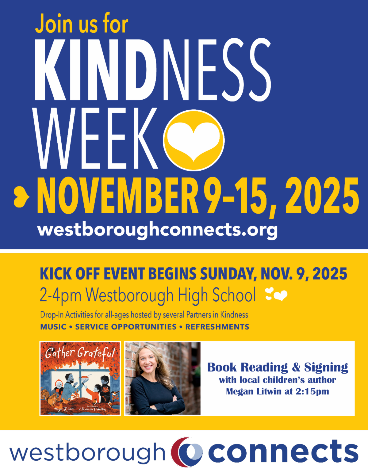 In case you missed it, our 8th annual Kindness Week in Westborough begins on Sunday! We'll send out another bulletin detailing Sunday's Kickoff to Kindness Week event. You'll also hear from us each day next week, with a short bulletin each day to highlight the theme and community initiatives happening.