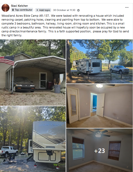| | Seen Recently on Facebook | | Thank you, Staci, for sharing about Woodland Acres (AR-137). You folks made quite an impact there! This camp (which also has a Sonrise Mailbox Club and a prison ministry) asks for three (3) SOWERs from March through November. Sign-ups are open! | | |