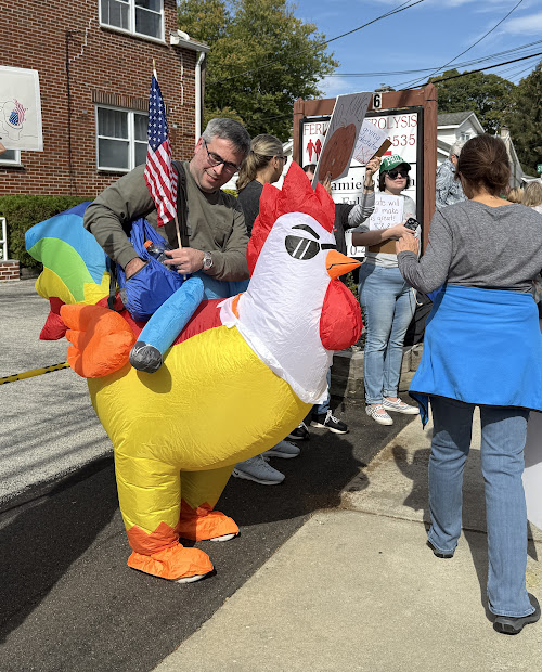 Below, clockwise from upper left: LWVCDC Advocacy Chair Jodine Mayberry and a friend at the Springfield Mall, an inflatable chicken and LWVCDC Vice President Cathy Yungmann and friends in Haverford.