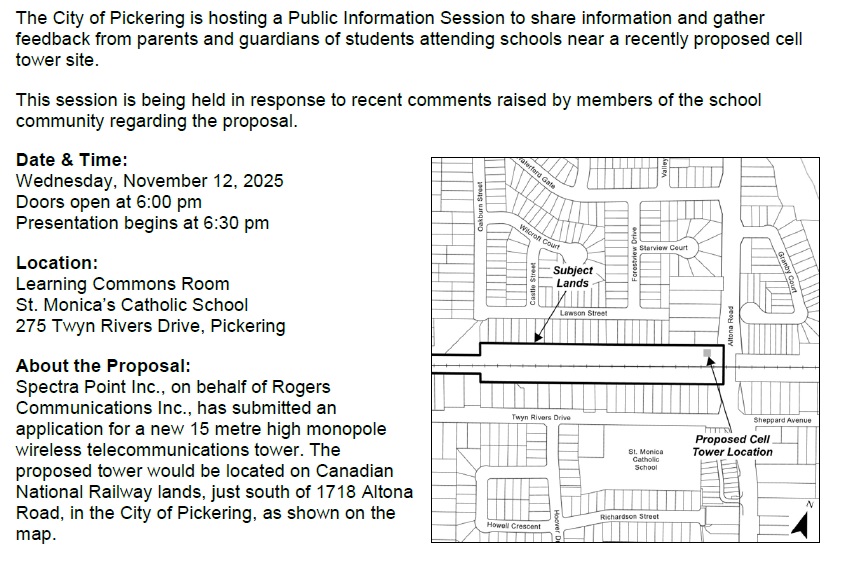 The City of Pickering does not have the authority to approve or deny cell tower installations. However, the City supports ISED’s consultation process by: