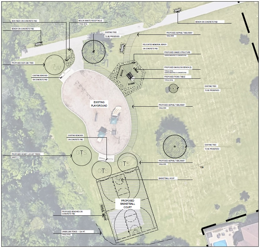 - Replacement of the existing court asphalt surface, line painting, and installation of new multi-use basketball nets