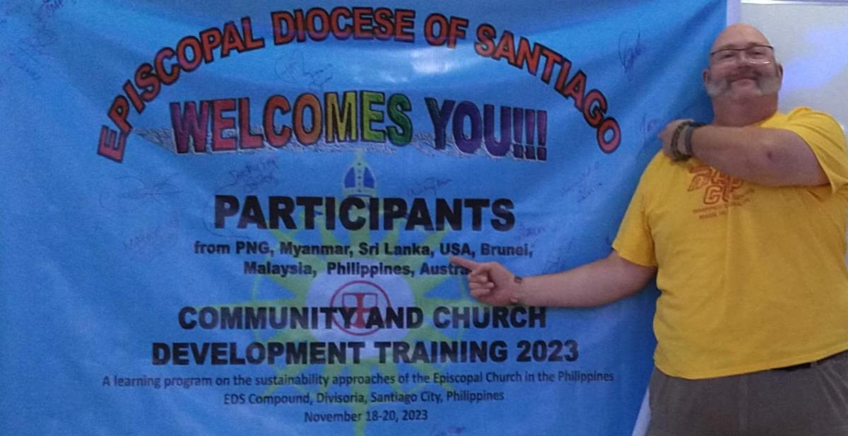 Missioner for Disaster Resilience, Mark Dibelka, stands with a banner signed by all participants in the training in the Philippines.