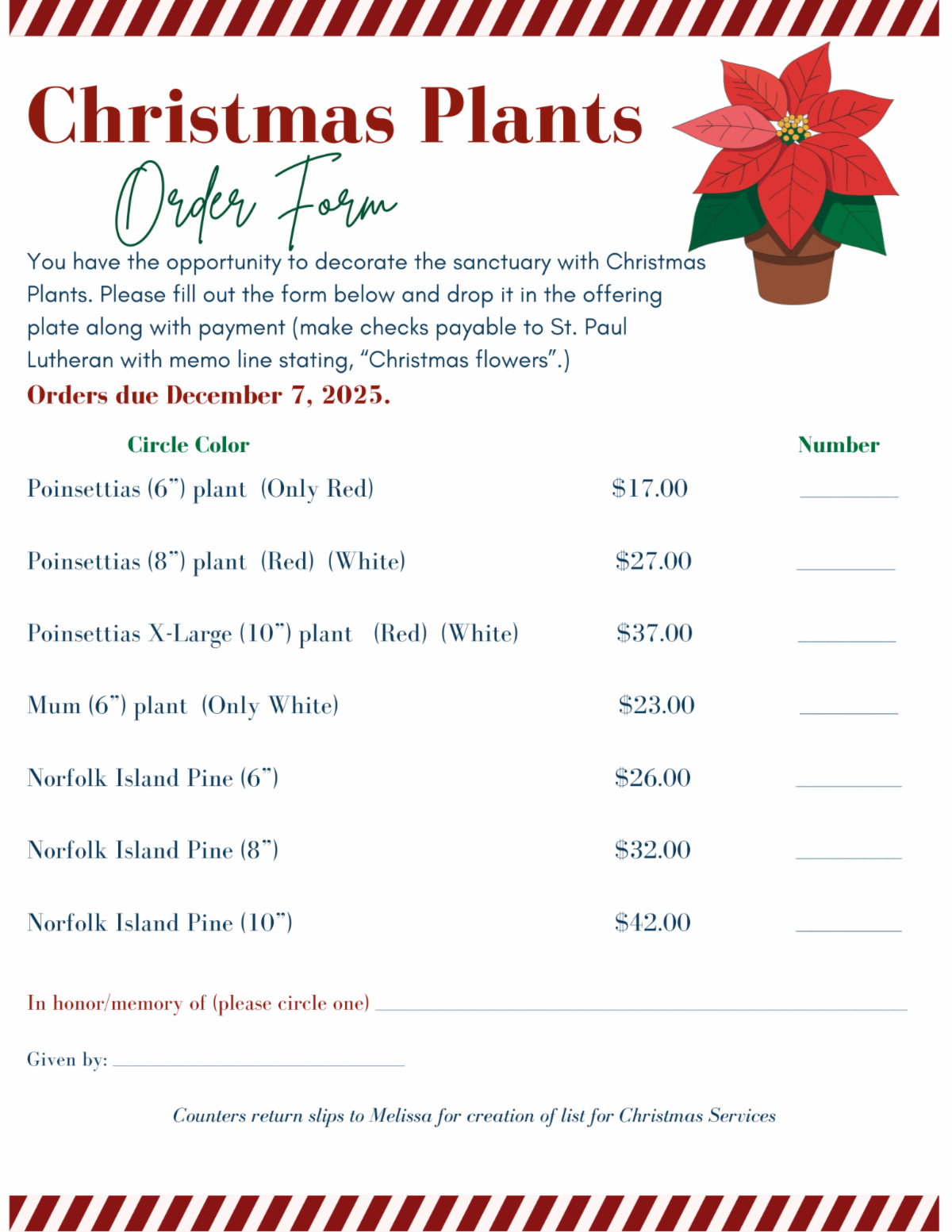 Beginning Sunday, November 23 through Sunday, December 7, we invite you to order Christmas plants to decorate the altar for Christmas Eve Worship.