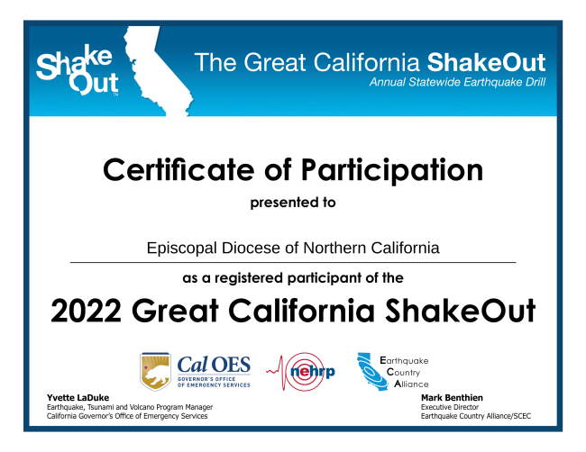 Although we earned a certificate of participation, our work isn’t done. Put a note on your calendars for October 19, 2023 for the next Great California ShakeOut event and look for tips throughout the year that will be brought to you with the assistance of some of our local congregations.