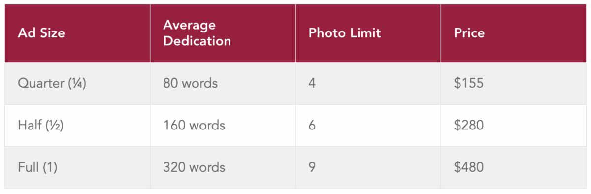 Have the School Design My Ad: Submit your message and photos for our award-winning Yearbook Staff to design. Digital pictures need to be formatted as jpeg, png, or tif.