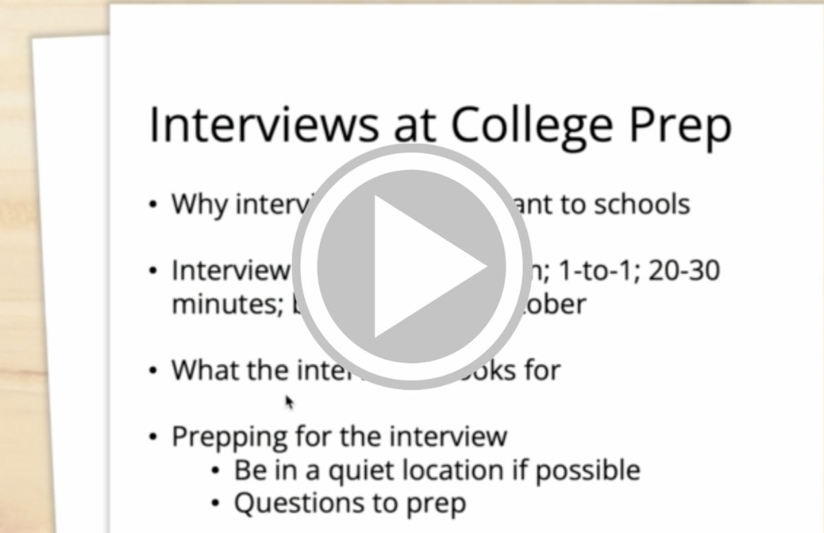 Interviews at College Prep are casual conversations that last around half an hour (20-25 minutes with the student followed by 5-10 minutes with the family). Interviews are not intended to be stressful—be yourself and have fun!