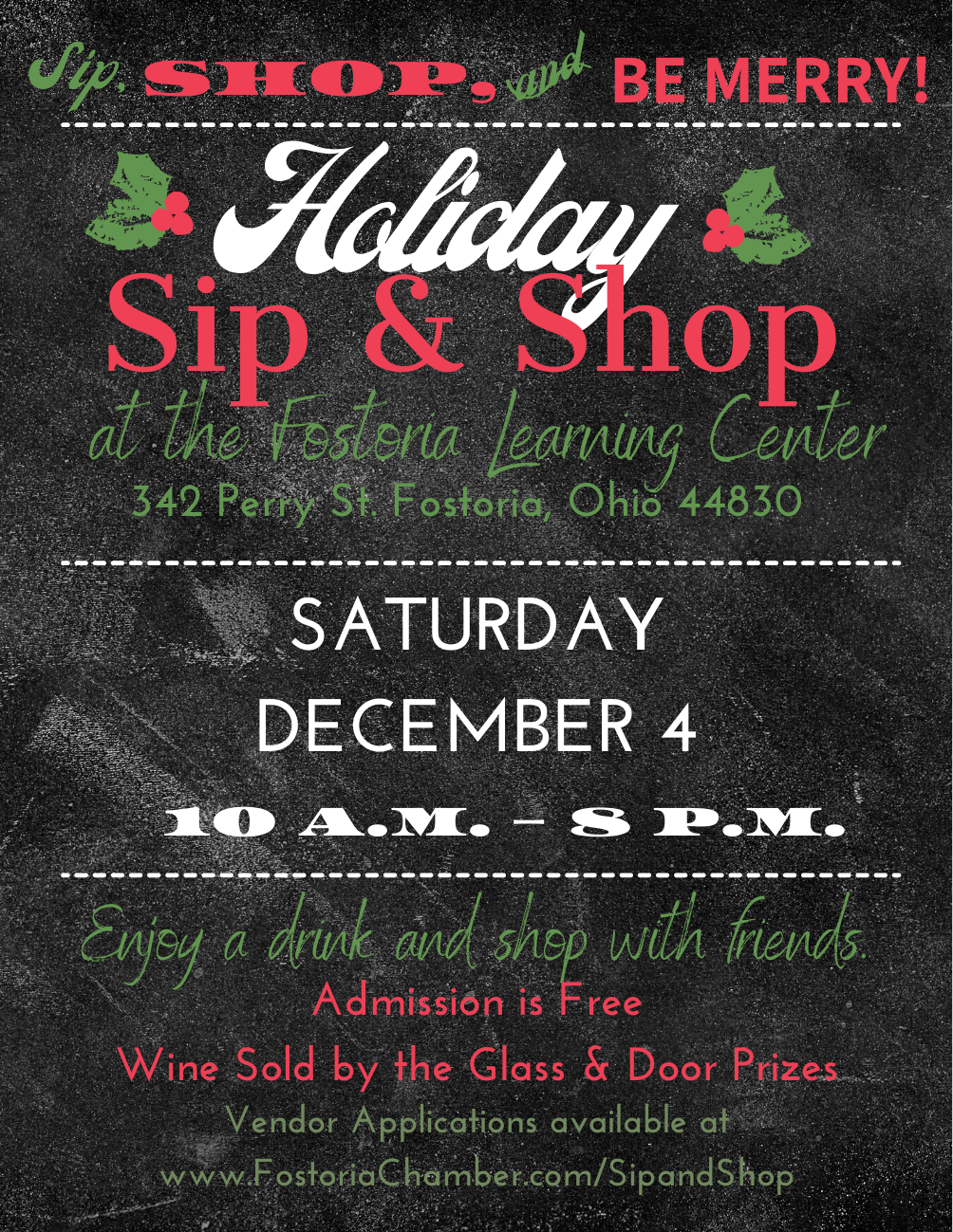 To register to enter (no charge) email FostoriaArts@gmail.com, message us here on face book or call us at 419-436-2787. Include your name, street address, email address and telephone number! Winners will be announced and contacted by December 17.