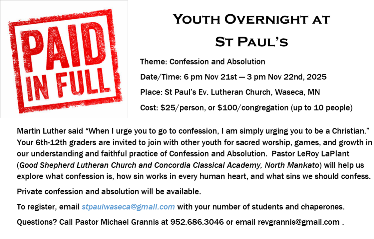 Preach and hear the Law—sharp and clear, let it sting. Live in the grace of Christ---He forgives (Colossians 2:13-14). And by the Spirit’s power, live the Law—not to earn favor, but to adorn the doctrine of God our Savior (Titus 2:10).