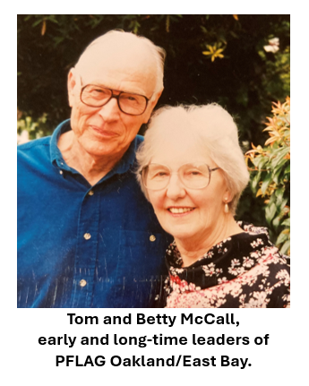 Betty’s daughter Betsy McCall remembers: “My mom was a joiner and organizer. I think she came to acceptance and understanding [that I was a lesbian] within a year or two of my coming out. By 1983 she was involved, helping run PFLAG, helping run the meetings… She decided PFLAG would be her mission in life.” Betsy and her spouse Chav were among the guests at our 40th anniversary celebration.