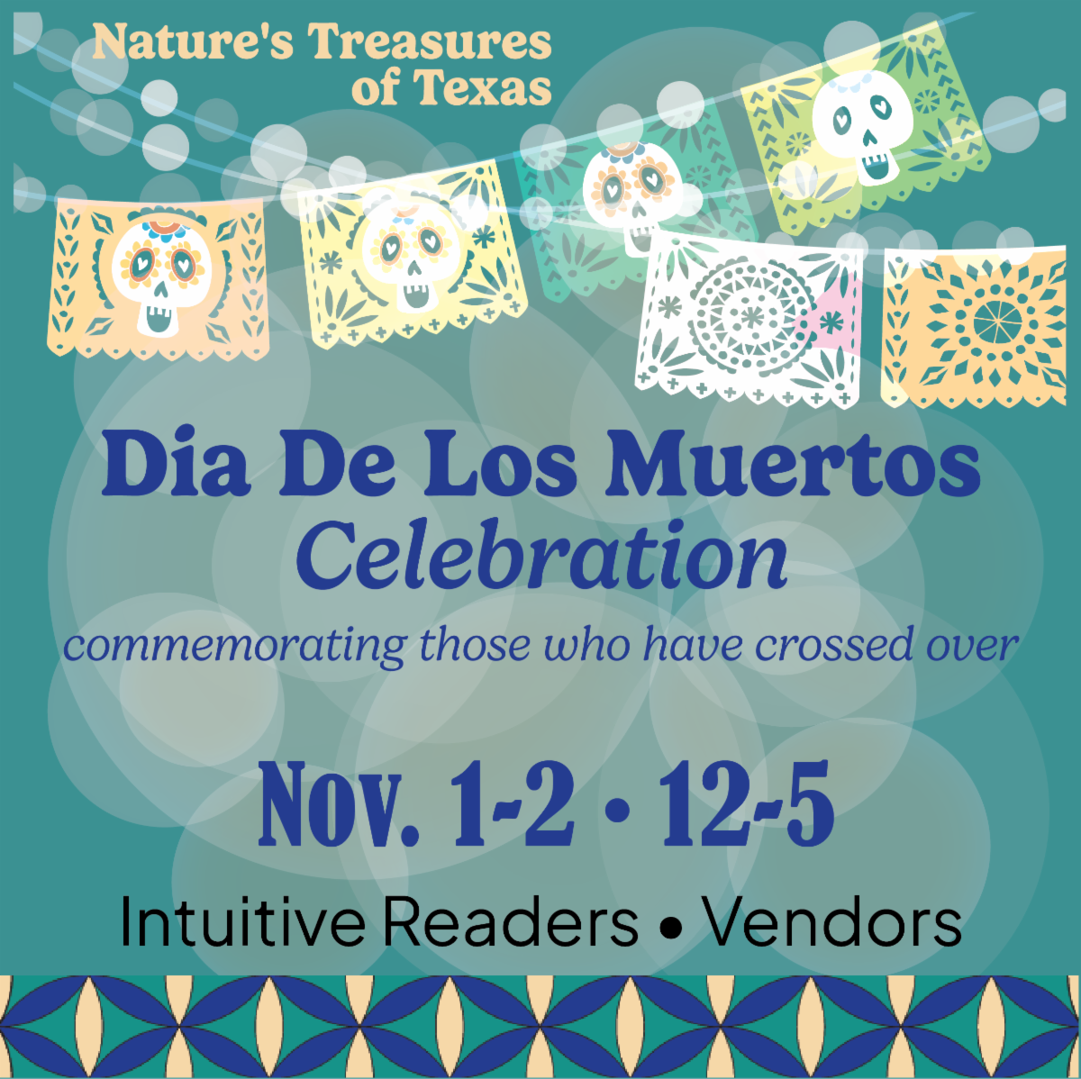 On Sunday from 12-5p enjoy music, a vibrant marketplace of vendors, and special readings as we gather together to honor the memories of those who have crossed.