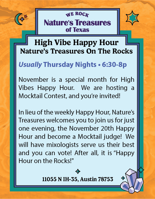In lieu of the weekly Happy Hour, Nature’s Treasures welcomes you to join us for just one evening, the November 20th Happy Hour and become a Mocktail judge! We will have mixologists serve us their best and you can vote! After all, it is “Happy Hour on the Rocks!"