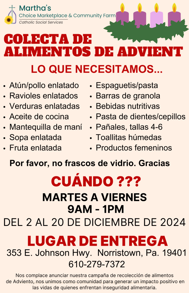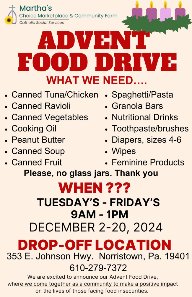 Martha's Choice Marketplace & Community Farm invite you to participate in Martha’s Advent Food Drive! Whether you can donate items, spread the word, or volunteer your time, every bit helps make a difference. | |