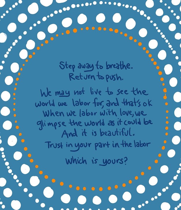 A reflection for today: “When you want to give up, call upon sources of bravery in your life– friends, family, ancestors, and/or the voice of your inner wisdom. Keep breathing and pushing. We must transition ourselves as we transition the world." Learn more about Valarie Kaur and Revolutionary Love.