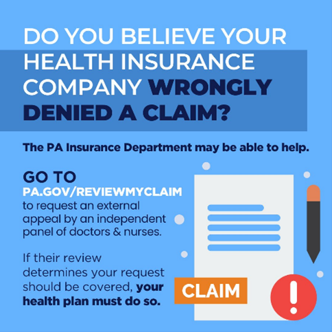 If you believe your health insurer wrongly denied a claim, the Pennsylvania Insurance Department may be able to help. Pennsylvania consumers with commercial health insurance can now ask for a review of denied health insurance claims. The Independent External Review allows you to share why your request should be covered. If the independent review organization decides the care should be covered, the consumer’s health insurer must cover the care. | |