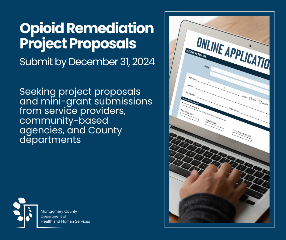 Montgomery County announces the Opioid Remediation Project Proposal application is now open for submissions. Interested parties are encouraged to apply by submitting their project proposal ideas aimed at combating the opioid crisis before the deadline of December 31, 2024. Montgomery County is set to receive eighteen (18) disbursements over an eighteen (18)-year period, totaling nearly $59.7 million from the National Opioid Settlements. These funds will be used to address the opioid epidemic and support those impacted by the crisis. Learn more, including key dates!