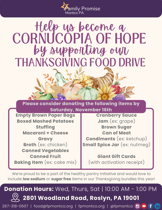 The chill is in the air, and the holiday season is just around the corner. If you’re looking to give back or organize a group volunteer activity, contact Family Promise Montco PA to plan a food drive or volunteer opportunity. Reach out to their Food Pantry Manager, LaToya Williams, at food@fpmontco.org. She can provide all the information you need to get involved and make a difference this season.